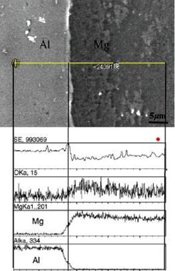 圖5是Mg/Al軋制復(fù)合界面的線掃描圖像,從圖中我們可以看到,穿過(guò)Mg和Al的界面進(jìn)行線掃描,可以得到,在Al的一側(cè),Mg含量低,在Mg一側(cè),Al幾乎為零;但在界面處,Mg和Al各大約占一半,說(shuō)明在界面處發(fā)生了擴(kuò)散,形成了Mg和Al的擴(kuò)散層。