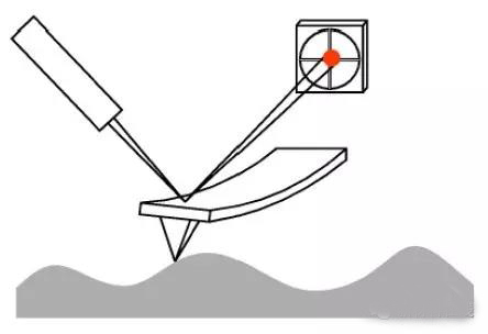 不過這里還有一個問題:針尖和物體表面之間的作用力是十分微弱的,我們該如何有效測量它的大小呢?這個時候前面提到的懸臂就派上用場了。由于針尖和懸臂是連在一起的,針尖受到的力會導致懸臂發生彎曲,受力越大,懸臂彎曲的越厲害。這樣,通過測量懸臂彎曲的程度,我們就可以知道針尖與物體表面之間的作用力的大小。但是懸臂由于受力而發生的彎曲依然很小,直接測量這么小的程度的彎曲并不現實。