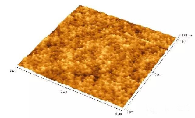 這里要解釋一下,圖中的顏色并非玻璃表面真實的顏色,而是任意選取來表示表面的高度變化。顏色淺的部分表明這個地方的高度高于平均值,而顏色深的地方表明該處高度低于平均值。從這張圖中我們可以清楚地看到,看上去非常光滑的玻璃表面在微觀尺度上實際上布滿了“崇山峻嶺”。通過這張圖,我們可以非常明顯地感受到原子力顯微鏡較之電子顯微鏡乃至光學顯微鏡的一大優點:可以直接得到三維的圖像。