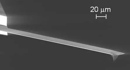 我們可以看到,圖中主要部分是一個長約100微米,寬約20微米的條狀物,我們稱其為懸臂。在懸臂的末端是一個更小的尖狀物,最末端的直徑一般只有十幾個納米,我們稱它為針尖。針尖和懸臂合起來構成了一個完整的原子力顯微鏡的探針,一般使用硅或者氮化硅作為材料??梢哉f探針是原子力顯微鏡最為關鍵的部件。
