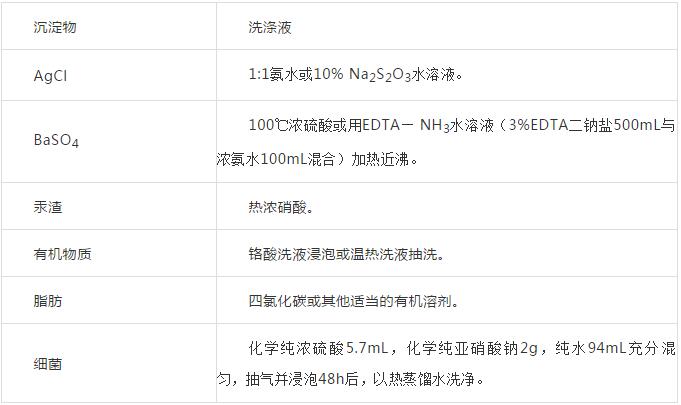(2)針對(duì)不同的沉淀物采用適當(dāng)?shù)南礈靹┫热芙獬恋恚蚍磸?fù)用水抽洗沉淀物,再用蒸餾水沖洗干凈,在110℃烘箱中烘干,然后保存在無塵的柜內(nèi)或有蓋的容器內(nèi)。若不然積存的灰塵和沉淀堵塞濾孔很難洗凈。表2 列出一些洗滌砂芯濾板的洗滌液可供選用。