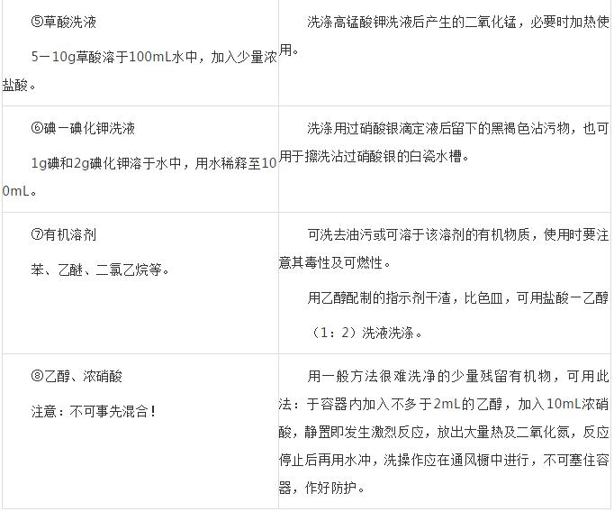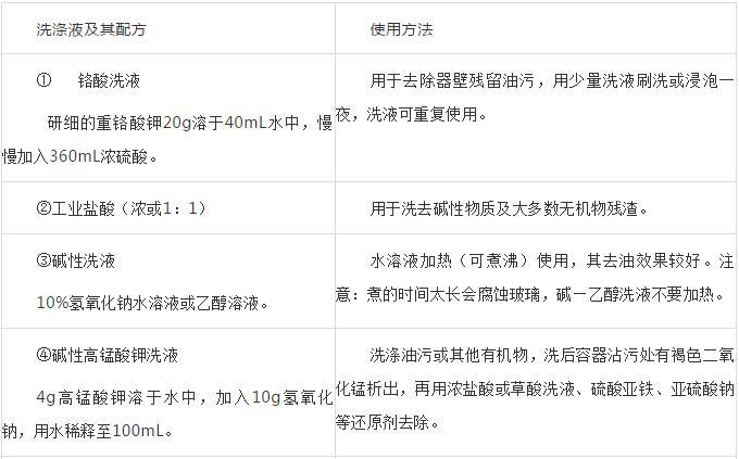 鉻酸洗液因毒性較大盡可能不用,近年來多以合成洗滌劑和有機(jī)溶劑來除去油污,但有時(shí)仍要用到鉻酸洗液,故也列入表內(nèi)。