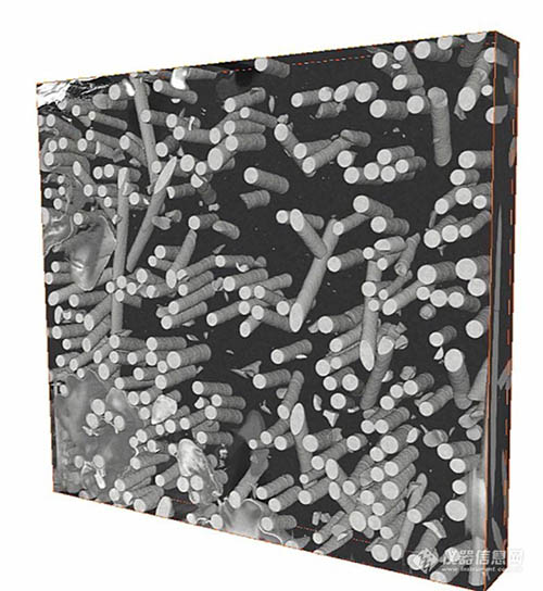 圖2.使用Helios Hydra CX DualBeam采用O+聚焦離子束和AS&V4軟件進(jìn)行自動(dòng)連續(xù)切片的汽車機(jī)油濾清器殼體(聚合物/玻璃纖維復(fù)合材料)的三維重構(gòu)。HFW(水平寬度)為350μm。
