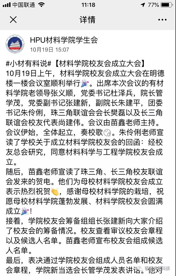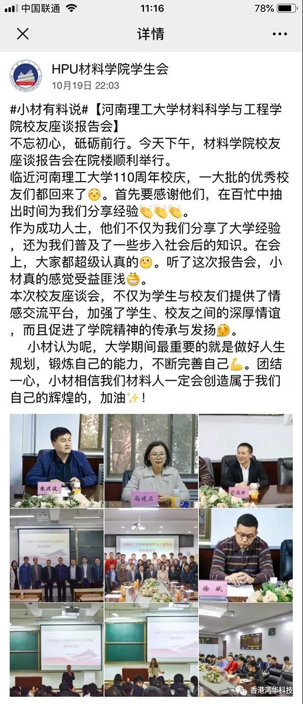金秋十月,在偉大祖國慶祝建國70周年華誕之際,河南理工大學迎來了建校110周年慶典,一大批優秀的校友們紛紛回校表示對母校的祝賀和感恩。鴻華科技有限公司總經理許高云先生回到母校參加了一些列校慶活動,并向母校捐獻110萬元設立研究生獎學金;同時鴻華科技有限公司在河南理工大學材料科學與工程學院校友會成立大會上被推選為河南理工大學材料科學與工程學院校友會理事單位。